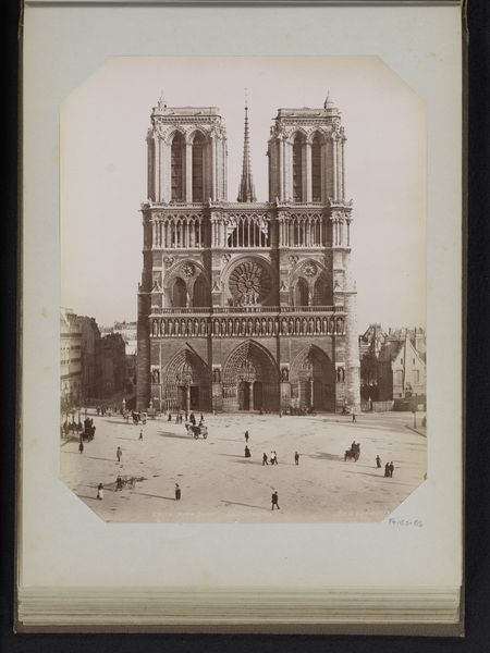 Editor: This is a photograph by Étienne Neurdein, titled "Façade van de kathedraal van Laon," taken around 1895. The aged paper gives it such a delicate, ethereal quality, almost like a dream. What strikes me most is the stark contrast between the immense scale of the cathedral and its almost faded appearance. What do you see in this piece? Curator: What I see here is more than just an architectural study; it's a commentary on power, faith, and the societal structures they uphold. This image, taken at a time of significant social upheaval, captures the enduring presence of the Church, but its faded quality hints at a questioning of its dominance. Look at the way the light renders the stone almost translucent – does this suggest fragility, a challenge to its seemingly impenetrable authority? Editor: That's a fascinating take! I hadn't considered the social context so deeply. I was focused on the aesthetics. Do you think Neurdein was intentionally making a statement? Curator: Intention is always complex to ascertain. However, by documenting this cathedral's facade in this particular way, Neurdein participates in a dialogue about permanence versus impermanence, authority versus skepticism. Photography, then a relatively new medium, itself challenged traditional forms of representation and, by extension, the institutions they often served. The choice to use a sepia tone, reminiscent of older processes, could be read as an engagement with history, inviting viewers to consider the cathedral's place within a changing social and political landscape. How does that influence your reading of the image? Editor: It makes me think about how even seemingly objective documentation like photography can be deeply subjective and tied to broader cultural conversations. I see it now – this isn’t just a pretty picture of an old building. Curator: Exactly! By considering the historical moment and Neurdein’s choices, we gain a richer understanding of this artwork and its potential meanings. Editor: Thank you, I never would have looked at it this way without your input! Curator: And your initial observation about the ethereal quality alerted us to the image’s nuanced effect! A perfect partnership.