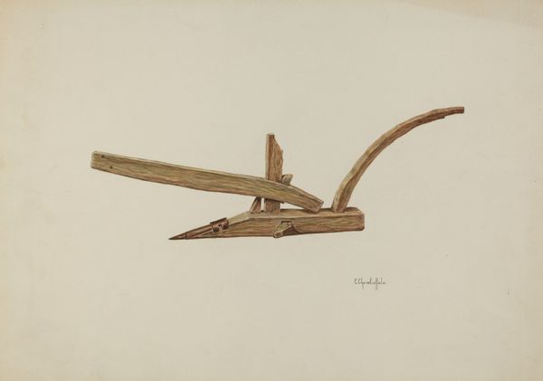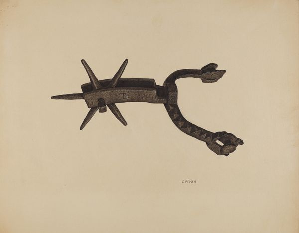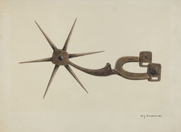 Editor: So this drawing is called *Spur*, by Cornelius Christoffels, and it dates to around 1936. It's made with colored pencils. It's fascinating how such an everyday object can look both dangerous and beautifully crafted at the same time. What kind of symbolic weight do you see here? Curator: Immediately, I see a symbol of power and control, of course, particularly in relation to animals, but it also whispers of cultural heritage, particularly the American West. A spur isn’t just a tool; it’s an emblem, deeply entwined with notions of mastery and dominion. How does the medium – the coloured pencil – affect your perception? Editor: That’s interesting, because the coloured pencil gives it a delicate, almost scientific illustration feel. If it were painted or sculpted, it might feel more imposing. The drawing feels very intentional. Curator: Precisely. The deliberate detail highlights not just function, but also artistry. Consider the star-like shape of the rowel. In other visual vocabularies, a star might signify guidance or aspiration, yet here, shaped into a spur, it represents directed force. Does that alteration in context change its deeper meaning for you? Editor: Definitely. It reminds me how symbols always exist in relation to other things. The same shape can mean different, even opposite things. Thinking about cowboys and the Wild West… isn’t there a romantic aspect too? Curator: Yes, but what narratives do we then overlook? The romantic image masks labor and environmental impact. As an object, the spur echoes the psychology of control, not only in relation to horses but even more subtly over land and destiny. It also represents a certain ideal of rugged masculinity and a by-gone era. It represents more than simple Western grit. Editor: Wow, I hadn’t considered the implications beyond horsemanship. Thanks for opening up that new perspective. Curator: And thank you for your insightful observations. Examining everyday objects reveals just how potent their visual language is.