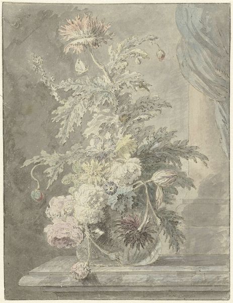 Curator: Standing here, we're face to face with "Flowerpiece with Prunes," crafted in 1703 by Rachel Ruysch, an oil painting from the Dutch Golden Age now held at the Academy of Fine Arts Vienna. It's remarkably detailed and sumptuous. Editor: It's quite heavy, don’t you think? A sense of ripeness almost tipping into decay... It makes me feel a little melancholic, like seeing beauty at its peak, knowing it’s fleeting. Curator: Precisely. Ruysch uses the oil medium masterfully to depict a cornucopia of blooms. Note how she contrasts light and shadow to create drama, a Baroque hallmark, really emphasizing the textural differences between, say, the velvety petals and the hard sheen of the prunes. Editor: Right, she's obsessed with surfaces, but also the dynamism within a seemingly still subject. I see diagonals everywhere, leading my eye on a twisting path from the prunes up through the tangle of flowers. It stops my eyes from resting, suggesting movement within this poised bouquet. Curator: Her talent went far beyond mere reproduction; she arranged these compositions so deliberately. There is this tension between the painting's constructed nature and this amazing lifelikeness. Editor: Yes! And the choice of specific flowers and the inclusion of fruit – these were definitely imbued with layers of symbolic meaning at the time. Prunes, for instance, could represent wealth and luxury but maybe also transience. What about insects? There's a tiny dragonfly near the rim of the vase! Curator: Good spot! That adds another level, an allegorical dimension representing time passing. In Dutch Golden Age painting, the smallest elements usually carry enormous weight. The artist transforms what appears at first to be decorative into this poignant contemplation of life and its natural processes. Editor: I am going away with this strange brew of delight and deep consideration, especially by considering that it was painted in the 18th century. Amazing that something can speak to you from so long ago... Isn't it something? Curator: Truly a privilege. To see how meticulously Ruysch studied her subjects and how she used artistry to breathe meaning into them! It resonates still after all these years.