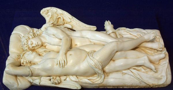 Antonio Canova carved this marble sculpture of Cupid and Psyche, held at the Louvre, capturing a pivotal moment in their myth. Cupid tenderly revives Psyche with a kiss. This embrace is a powerful symbol of love, redemption, and the soul’s journey. Consider how the winged Cupid echoes figures of angels in Christian art, or the ancient Greek god Eros. Wings denote transcendence, spiritual elevation. The motif reappears across cultures, signifying divine messengers or the soaring human spirit. Here, wings connect earthly passion with higher, ethereal realms. Notice Psyche’s languid pose, her arms outstretched, echoing gestures of figures in classical art. These gestures have psychological resonance, expressing vulnerability, acceptance, surrender. This composition evokes subconscious memories and archetypes embedded in our collective psyche. The myth of Cupid and Psyche, in this Neoclassical form, powerfully engages us on a deep, emotional level. These symbols reflect the non-linear progression of images through time, resonating in ever-changing contexts.