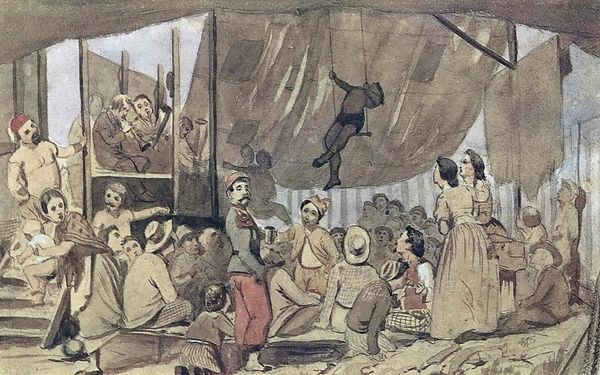 Editor: Azim Azimzade's "Folk Performance Kos Kosa," created around 1930 using oil paint, depicts a lively gathering. The energy emanating from the painting is really infectious; everyone seems caught up in the moment. What exactly do you see in this piece beyond just a folk celebration? Curator: Beyond the immediate sense of celebration, I see a carefully constructed image deeply embedded in the cultural and socio-political context of its time. Consider, for instance, the artist’s choice to depict this specific folk performance. Do you think such a portrayal might have served a particular purpose during the 1930s in Azerbaijan? Editor: You mean like promoting national identity, or something similar? Curator: Precisely. Art often played a role in shaping and reinforcing national identity, especially under the Soviet Union. Think about how these portrayals of 'folk' life could have been used to construct a certain narrative, both for internal consumption and external presentation. Do you notice any details in the composition that might support this idea? Editor: Well, the emphasis on community and tradition seems to fit that idea. Plus, everyone seems very… united and happy. But are we at risk of imposing our modern interpretation on a past work? Curator: It’s always a risk, but we must strive to understand the layers of meaning that circulated when the work was first created and viewed. We can consider not only the artist’s intent, but also the curatorial practices and institutional frameworks that exhibited such works. This painting speaks volumes about the construction of cultural narratives and the role of art in shaping them. Editor: That's definitely given me a lot to consider regarding the cultural function of this painting. It seems "Folk Performance Kos Kosa" goes beyond simple documentation of cultural events. Curator: Indeed. It provides a lens through which we can understand the complex interplay between art, society, and politics in a particular historical moment.