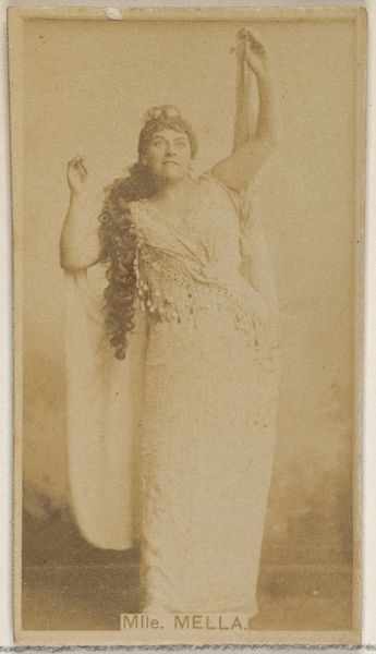 Curator: Here we have a piece titled "Lillian Russell, from the Actors and Actresses series (N45, Type 8) for Virginia Brights Cigarettes," made between 1885 and 1891 by Allen & Ginter. Editor: The first thing that strikes me is the sepia tone; it imparts a wistful, antique feeling to the image. The subject's pose is interesting—regal, almost goddess-like, yet softened by the medium. Curator: Absolutely. The photographic print itself functions almost as a stage. Lillian Russell, the Gilded Age celebrity, embodies Venus. Observe the line created by her arm; it leads the eye upward toward what seems to be some sort of wreath in her hair. The drape of the fabric, though simple, accentuates the curve of her form. Editor: It’s interesting you mention Venus, because the wreath reminds me of classical representations of deities, imbuing her image with a timeless, almost mythological significance. Consider the intended function; this wasn't high art, it was an advertising card inserted into cigarette packs. This elevated Lillian Russell, and by association, Virginia Brights Cigarettes. Curator: Indeed. The series itself plays on the theatricality inherent in celebrity culture. Note also the strategic use of light and shadow—the sharp contrast on the left to the smooth gradient of the background behind her hints at the mechanics of portraiture itself and what kind of symbolic value it had at that period. Editor: So this conflation, of actress, goddess, and commodity; what cultural expectations does that play on, I wonder? Certainly, the iconography blends together the realms of entertainment, beauty, and aspiration, and perhaps the transience of all three. Curator: I'd add the temporality of the photograph itself to your reflection about transience. Photography, in a sense, suspends time—a still moment meant to live beyond the lived present. This image offers a microcosm of the Gilded Age’s obsessions: beauty, fame, and the nascent culture of mass consumption. Editor: Looking at this artifact, I'm struck by how advertising so seamlessly incorporates powerful, resonant images to forge an association with a particular product. It really shows how potent even small everyday images are, and how deeply symbolic forms connect with an audience's imagination and desires. Curator: Ultimately, this tiny photograph represents so much about late 19th-century society if you just spend time closely observing its carefully calibrated aesthetic structure.