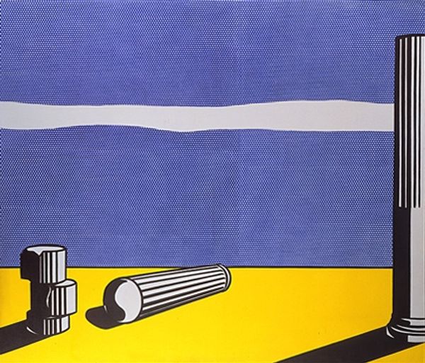Roy Lichtenstein made this "Arctic Landscape" using oil and magna on canvas. The composition is divided into three horizontal bands, creating a simplified scene: the blue of the sky and sea, a white band of cloud or ice, and a yellow strip representing the land. What immediately strikes the eye is the use of Ben-Day dots, a signature element in Lichtenstein's Pop Art. These dots, systematically arranged across the canvas, flatten the image and reduce the landscape to a field of pure optical sensation. This technique disrupts traditional notions of depth and perspective. The wavy lines of yellow and black at the bottom act as stylized contours of land. This landscape isn’t just a depiction of a scene; it's a commentary on representation itself. By mimicking the mechanical reproduction of comic books, Lichtenstein challenges the distinction between high and low art, questioning how we perceive and categorize visual information. This is not simply a landscape, but a landscape seen through the lens of mass media.