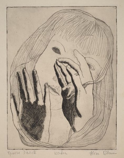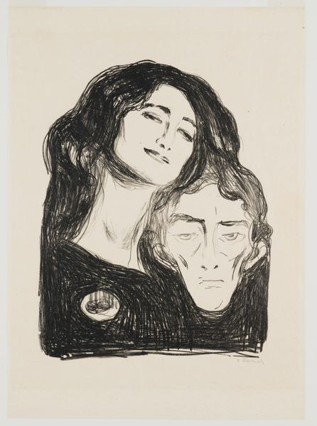Curator: So, we’re looking at "Lovers II" by Joy Hester, created in 1956. It’s an ink drawing, a striking monochrome portrait of two figures intertwined. Editor: My first thought? It’s a desperate kind of love. Not the fluffy clouds and sunshine kind. The stark contrast feels heavy. Almost suffocating. Curator: It’s definitely intense. The ink wash creates a sense of drama, wouldn't you say? It reminds me of the emotional turbulence Hester was exploring in her life at the time. She really knew how to let rip. Editor: Well, speaking of ink... look at how the density shifts! How economical is this mark-making? You could easily analyze the market availability of materials after WWII for art-making in Australia, or see how the limited material directly shaped her technique. Curator: I do like that! It does seem as though, for Hester, limitations acted like rocket fuel for her expressiveness! She just poured feeling directly onto the page. I see a rawness, like a soul stripped bare. That face tilted upwards--she’s completely exposed. Vulnerable. Editor: True, but what about the looming, darker figure behind? Is that about overbearing power dynamics? We need to question what forces were shaping societal expectations in Australia and especially women in the arts. Curator: Possibly. The male figure *is* rendered so bluntly, just those slits for eyes! Maybe a commentary on the blindness of some of the blokes around her... You get the impression Hester found connection tricky but vital, judging from the recurring lover/obsession theme throughout her practice. Editor: Well, and it’s not just lovers, but always through portraiture. Thinking about her drawings, it challenges the preciousness associated with high art while she's documenting something very palpable within arms reach. Curator: It really does. Her unflinching look—it's why her art grabs me. Looking at it, I’m left wondering: how brave can you be, when expressing yourself so candidly? Editor: Yes, Hester holds up a mirror, but distorts the surface just enough so we recognize how warped reality can become. It’s this tangible approach that moves away from the elite circles and gives us, the viewer, something real to reckon with.