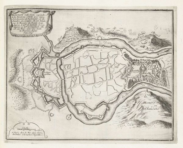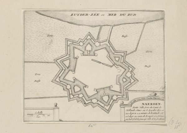 Curator: This is a plan of Longwy, a city in France, created around 1693-1696 by an anonymous artist. It's made using drawing, print, ink and engraving on paper. It feels incredibly precise, almost sterile in its detail. What do you make of it? Editor: Well, it reminds me a little of architectural drawings. But there’s something more going on here with this bird’s-eye view, like an agenda of power and control in how this city is represented, that seems to go beyond mere architectural data. How would you interpret it? Curator: Absolutely! Think about what this map *does*. It isn’t just a representation of Longwy; it’s a projection of power. The perfect geometric shape imposed upon the landscape signifies control and order, masking the lived realities of the people within. Who benefits from this portrayal of order? Who might resist such imposition? Editor: So you’re saying the map is a tool of social and political engineering? Almost like a blueprint for domination rather than simply reflecting a reality? Curator: Precisely! Maps have long been implicated in colonization and control. Think about how indigenous lands are often re-drawn, re-named, and claimed through cartography. Editor: That makes a lot of sense. I never thought a city plan could hold so much political meaning! It makes you wonder what realities were deliberately omitted. Curator: Exactly. This drawing prompts us to think about the power dynamics inherent in representation itself. Who gets to draw the map, and whose stories are left off the page? Editor: Food for thought – it's challenged me to look at maps very differently. Curator: And hopefully, consider whose voices we aren’t hearing, and whose lands are being reshaped, even today.