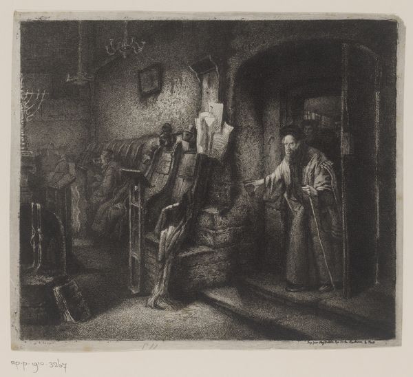 Curator: Here we have Guillaume Joseph Vertommen’s "Company of Five Drinking Warriors by a Hearth," an etching dating back to 1850 and housed right here in the Rijksmuseum. What’s your initial read? Editor: Immediately, it feels…dim. Almost claustrophobic. The figures are gathered so tightly in this space, lit mostly by what I assume is the hearth, it has a certain intimacy to it, or perhaps a weariness, after a long day’s march, no doubt. It feels incredibly…grounded. Curator: That’s astute. Genre scenes like this were very popular in the mid-19th century. Artists were really turning their attention to the everyday lives of ordinary people, which signaled a broader shift in social consciousness, particularly with movements like realism gaining momentum. Art was meant to mirror society, capturing slices of life as they were, or as some hoped to see them represented. Editor: Mirroring society, maybe...but through whose eyes? These 'warriors', cozy with their tankards in their hideaway are probably romanticized versions, don’t you think? But still, I get a feeling of shared stories, that camaraderie built from shared danger or difficulty. You can almost hear their voices, slurred slightly by drink and exhaustion, telling tales both real and exaggerated. Curator: There's undoubtedly an element of romanticism here, shaping a narrative perhaps more palatable for a public keen on heroic imagery and sentimental tales, though Vertommen grounds the scene in realism, which gives it weight, an almost journalistic quality that suggests he is documenting an unadulterated observation, while elevating an historical one. He's inviting the viewer to step inside, not just observe but also partake, engage with these figures, and consider the times they are living in. Editor: Exactly, you’ve got to wonder about their context! Were they mercenaries? National soldiers? Or are they just role-playing, indulging in historical fantasy in a troubled time? And that darkness—it obscures more than it reveals, adding layers of uncertainty that I, as an observer, just can’t shake loose. A certain discomfort rises in the darkness; in this ‘slice of life’ as you call it. Curator: It leaves us, as present-day viewers, wrestling with more complex issues. "Company of Five Drinking Warriors" serves less as a transparent depiction and more as a point of entry into debates about memory, representation, and the shaping of historical and political narratives in art. Editor: And that’s exactly what makes this image stay with you! Cheers to that.