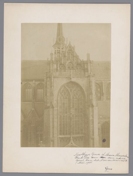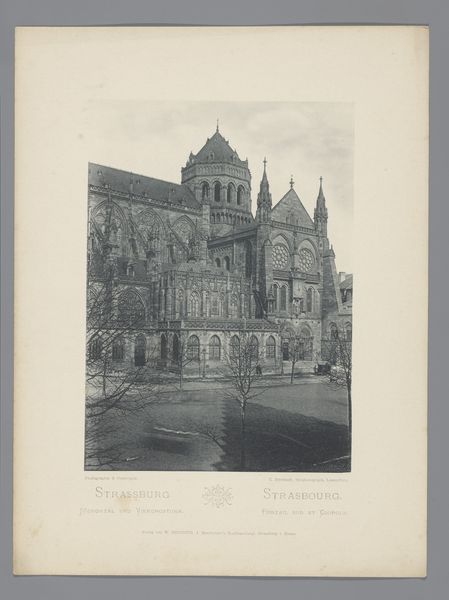 Curator: Before us, we have a photograph titled "Gezicht op de kathedraal van Metz," created before 1894 by Charles Bernhoeft. Editor: The grayscale immediately pulls you into a historical context. It has this looming, gothic aesthetic… the cathedral almost vibrates with detail. Curator: Precisely, notice the almost relentless repetition of vertical lines drawing the eye upwards, the acute angles in the gothic arches creating dynamism in an otherwise still, captured moment. This structural element dominates the composition. Editor: Yes, and what of the labour to erect this formidable structure? Consider the immense scale, and how photography served as documentation for, perhaps even promotion of, civic pride or religious might, for those who consumed images like this one. Think of the quarry workers, the stone masons, and their contributions to Bernhoeft's composition. Curator: I understand your point about production, but my focus remains on the intrinsic, its inherent visual language. Consider how Bernhoeft’s sharp focus pulls the Cathedral forward, separating it tonally from the background, really emphasizing its volume. The strategic placement of those tiny figures at the bottom right offers us the perspective necessary to really understand the volume. Editor: Right. Speaking of volume, notice that what may appear a grand edifice, its physical and spiritual impact also hinged upon material accessibility and economics –photography as the purveyor, and the public, increasingly eager consumers of this accessible perspective. Curator: I see how it captures a certain spirit of an era that really valued monumentality. It's more than just architecture, its Bernhoeft really using these gradations to speak of power. Editor: Indeed, power made visible. An image carrying layers of human toil and aspirational grandeur in a single exposure.