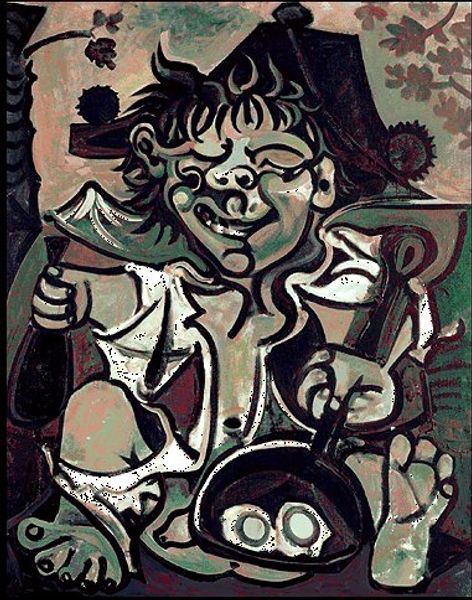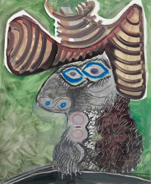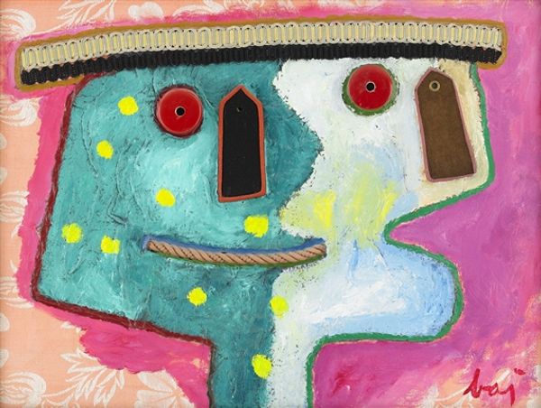 Enrico Baj created 'Fire! Fire!' using paint and collage elements. The immediate visual experience is one of alarm and crude figuration, with a roughly rendered character set against a patterned backdrop. Baj integrates found objects like buttons and mechanical parts, challenging traditional painting. The figure’s green, patchwork-like body and raised arms evoke a sense of primal fear, a stark cry for help. This juxtaposition of industrial and organic forms critiques the post-war anxieties about technology and dehumanization. The artwork can be interpreted through semiotics. The mechanical eye and fragmented body act as signs, pointing to a society increasingly dominated by machines and threatened by its own creations. The patterned background, reminiscent of domestic interiors, ironically contrasts with the chaotic figure, highlighting a disturbance in the social order. The rawness of the materials and the gestural quality of the paint underscore the work’s emotional intensity. Ultimately, 'Fire! Fire!' functions as both an aesthetic statement and a critical commentary on modernity.