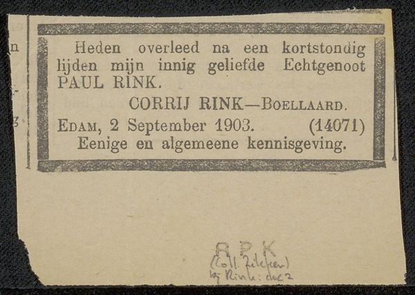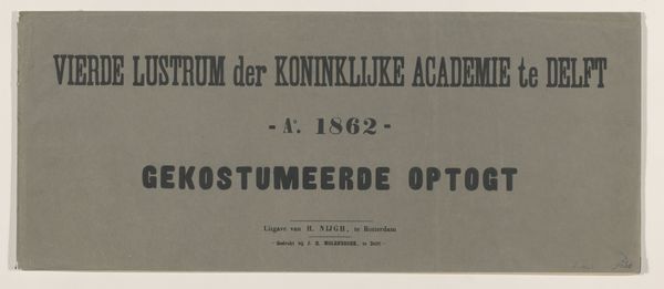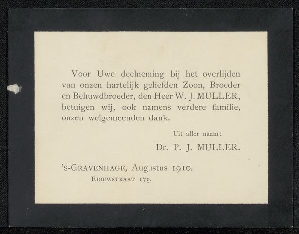 Editor: This print, likely dating from the late 19th century, is titled "Overlijdensbericht aan Philip Zilcken"—or "Obituary to Philip Zilcken." It's essentially a paper notice, a death announcement. There's something strikingly direct and vulnerable about its stark presentation. What stands out to you? Curator: It's interesting to consider how such ephemera functioned in the late 19th century. This wasn’t simply a private communication; it had a public function, shaping the social landscape. Notice how it carefully delineates Jan Vrolijk's identity: a husband, a father, an artist, and a Knight. What does it suggest about the role of social status even in death announcements? Editor: It's like crafting a public persona, even at the end. The inclusion of "Ridder in de Orde van de Eikenkroon"—Knight of the Order of the Oak Crown— feels deliberate. Was this common? Curator: Absolutely. Think about the rising middle class at that time. Memorializing accomplishments served to legitimize social standing. What else can you observe about its design and the culture surrounding it? Editor: The calligraphy lends a certain gravitas. Though simple, the notice conveys solemnity and dignity. Also, it feels quite economical, very different than the elaborate displays of mourning sometimes associated with the Victorian era. Curator: Exactly. It points to a spectrum of funerary practices. While some grieved with ornate excess, others favored understated pronouncements. Also, its connection to Zilcken hints at a network of artists; we get a glimpse of the social fabric of the artistic community through these kinds of public documents. Editor: I see how this small piece of paper reveals a broader picture about society and artistic circles at the time. Thank you! Curator: My pleasure! Examining everyday artifacts allows us to better comprehend historical complexities, revealing the nuances behind historical assumptions.