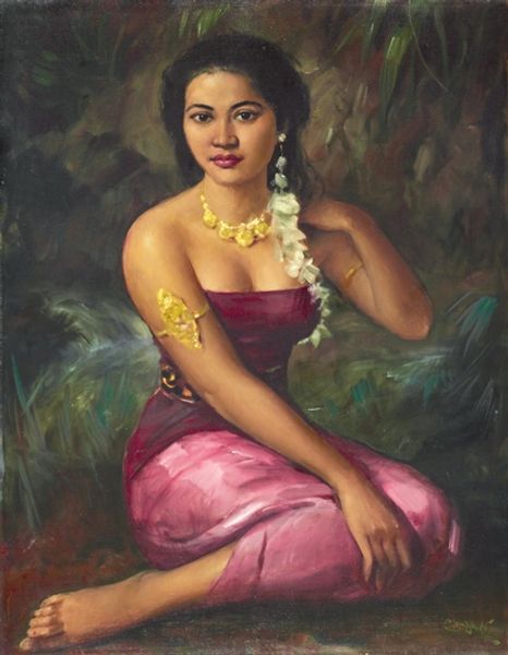 Basuki Abdullah painted this oil-on-canvas portrait, titled "Wanita Berkebaya Hijau," in Indonesia. Abdullah was best known for his academic style. He received his art education in the Western tradition, during colonial times. He was even commissioned to paint portraits of European royals and heads of state. Here, Abdullah used his artistic skills to render an Indonesian woman wearing a 'kebaya', a traditional blouse-dress. The 'kebaya' is a cultural symbol of Indonesian identity. The woman's elegant and poised demeanor reflects the values of Indonesian culture and high society. Abdullah’s work is a complex negotiation between Western academic style and Indonesian cultural identity. It is something that continues to inform Indonesian modern and contemporary art. To understand the dynamics of Indonesian art, we can look into the development of art institutions, art education, the art market, and the impact of post-colonialism. All these aspects provide valuable insights into the work of artists like Basuki Abdullah.