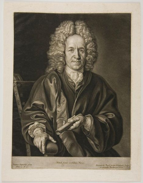 Editor: This is a portrait of Arthur Maynwaring, made by Jan Faber the Younger. The dramatic use of light and shadow really jumps out. What formal qualities strike you most about this piece? Curator: Notice how the composition directs our gaze first to the elaborate wig and then to the subject's face, a visual hierarchy achieved through contrasting textures and tonal values. How does this controlled arrangement influence your perception? Editor: It feels like the wig is the most important part, drawing more attention than his face. It overshadows his expression. Curator: Precisely. Consider also the sharp contrast between the detailed rendering of the face and the more generalized treatment of the background. It's a deliberate strategy of the artist to emphasize form and status. Editor: So, the way the elements are arranged and rendered creates a certain feeling of importance. Thanks for helping me see that. Curator: Indeed. The artist's choices guide our interpretation, highlighting the interplay between form, technique, and meaning.