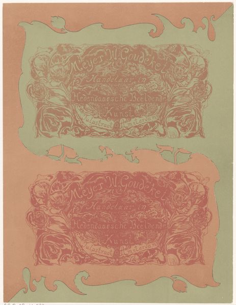 Curator: It's charming, isn’t it? Like a page torn from an old bestiary. There's something soothing in its repetition of form. Editor: Indeed. What we're observing is a work from Dessauerschen Buntpapierfabrik, titled "Blad met verschillende vogels met bloemen en vruchten," which translates to "Sheet with Various Birds with Flowers and Fruits," created sometime between 1850 and 1920. The print, realized in drawing and woodcut, is remarkable for its repetitive use of organic shapes and folk-art motifs. Curator: Repetitive, yes, but not without its internal variations. I see a calculated asymmetry. Each bird, each sprig of foliage, is slightly altered, a formal exercise in mirroring with just enough difference to catch the eye. And that muted gold against the faded pink…a deliberately quiet palette. Editor: That very palette suggests its context within a particular visual culture. These patterns were likely produced as decorative papers, popular at the time for lining boxes, drawers, or even as book covers within domestic settings, reflecting bourgeois values of domesticity and display. Consider also the increasing role of printed imagery in circulating knowledge about the natural world among different audiences. Curator: A subtle interplay between the object’s materiality and our viewing of it now as art…interesting. Looking at the work, the varying textures created through the woodcut process contribute immensely to the tactile quality of the piece. There is something deeply pleasing about the linear precision of the birds contrasted against the mottled effect of the woodgrain. Editor: It underscores how art and industry were intertwined. The printing process itself democratized imagery. This print represents access, perhaps limited but very real, to depictions of flora and fauna for wider segments of society, moving such knowledge from the realm of the wealthy to the middle classes. The folk-art theme nods to an idealised rural past but made available through contemporary industry. Curator: Perhaps a romantic gesture amidst industrial change. Still, formally, there is something profoundly compelling about the overall design that transcends its historical context. The distribution of positive and negative space alone makes the design aesthetically remarkable. Editor: Yes, it speaks to a particular moment when aesthetics served clear societal roles—education, social distinction, entertainment—often working simultaneously. An intriguing artifact of its era.