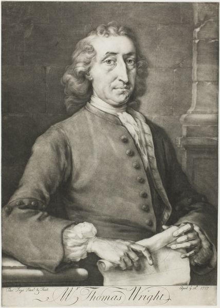 Editor: We are looking at a self-portrait from sometime between 1755 and 1769 of Engel Sam when he was around 60 years old, painted in oil. The painting seems rather subdued; the color palette is fairly limited and the man looks quite serious. What do you see here? Curator: I see a deliberate construction of identity, playing on the visual codes of respectability in the mid-18th century. Think about who would commission or create such a work. Was it purely personal, or intended for a specific audience? Self-portraits at this time functioned less as candid reflections, and more as carefully orchestrated declarations. Editor: So, you’re suggesting it's less about true self-revelation and more about social presentation? The clothing and wig appear deliberately chosen, wouldn't you say? Curator: Precisely. The austere clothing and formal wig represent his standing within society. The location would have an effect as well. It wasn’t simply about hanging art in a private home; galleries were growing more common and public access changed art’s role. How do you think the piece speaks to the societal conventions of the time? Editor: That's an interesting way to look at it! The piece shows status as an aspiration and reflects the artist's place within his social context. Thanks, this reframes my view of the portrait entirely. Curator: My pleasure. Considering the societal currents can help enrich our interaction with works of art, and it helps us engage with a dialogue across time.