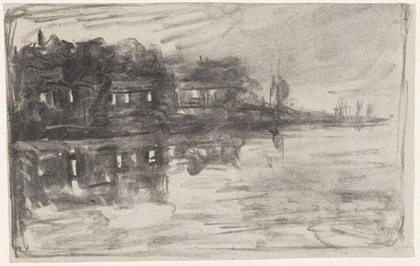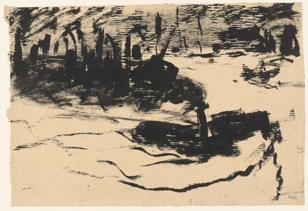 Editor: We're looking at "View of a Harbor with Factories", an ink drawing by Mark Rothko. It’s striking, but the scene it depicts is rather grim—those stark, dark industrial structures against the water. What can you tell us about this piece? Curator: Rothko’s choice to depict this industrial scene, most likely in the early stages of his career, speaks volumes. Look at the context: the burgeoning industrial age, the social realities of urban life, and the ways artists were grappling with representing this new world. Does this rendering evoke a celebration of industry or something more critical, perhaps a lament? Editor: I see both. There's a definite energy, a rawness in the quick, bold strokes, but the monochrome palette feels somber. I wonder how the art world received imagery like this. Curator: Initially, such works often faced scrutiny. The art establishment of the time wasn't always receptive to depictions of everyday, often harsh, realities. There was often an expectation of beauty and idealized subjects. Artists like Rothko, however, were pushing the boundaries, influencing the role of art as a social commentary and visual expression. Why do you think he chose a harbor scene specifically? Editor: Maybe he was commenting on the relationship between industry, trade, and their impact on the environment. The smoke stacks against the sky, for instance, feel particularly loaded. Curator: Precisely. Consider the harbor as a space of both arrival and departure, a symbol of commerce and its associated consequences. How does that reading affect your understanding of Rothko’s later, abstract work? Editor: It makes me wonder if those rectangles of color are less about pure aesthetics and more about…emotions distilled from real-world experiences like this harbor. I appreciate learning how social context really shaped artists. Curator: Indeed. Understanding art through its historical and social lens illuminates the power dynamics and ideologies at play, changing our interpretation and inviting deeper engagements with visual culture.
