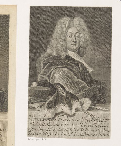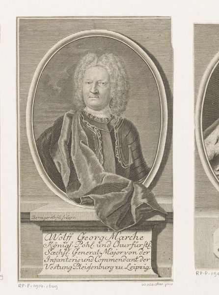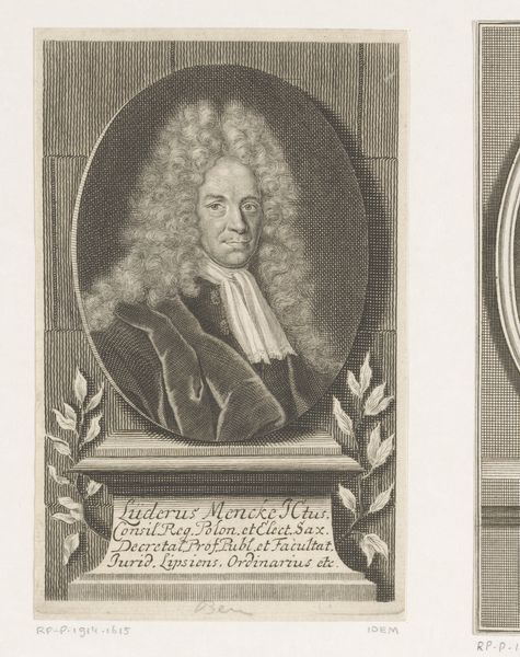 Editor: This is "Portret van Johann Christoph Wentzel," made between 1694 and 1733 by Martin Bernigeroth. It’s an engraving on paper, so a print. The detail is incredible! It's a very formal portrait, but I’m struck by how the swirling lines of the hair contrast with the rigid frame. What jumps out at you when you look at it? Curator: Formally, the tension you noted is intriguing. Note how the ovoid of the containing frame is echoed in the curves of the wig, and further emphasized in the soft turn of the sitter’s collar. The image's success rests on the artist’s control of line—consider the differing weights used to delineate form, creating areas of stark contrast versus subtle gradations. It makes the sitter quite present. Editor: The line work is certainly impressive. So, if you were to set aside any knowledge of who this man was, what could you tell about him, solely from looking at the print itself? Curator: Ignoring contextual information and focusing on pure form, observe the calculated composition. The artist masterfully employs hatching and cross-hatching techniques to model Wentzel's face, imbuing it with a three-dimensionality that belies the medium. The textural contrast between the meticulously rendered wig and the smoother surfaces of his face and clothing further enlivens the image. A mastery of visual elements allows this piece to transcend pure representation and achieve artistic merit. Editor: It’s interesting to consider art this way, focusing purely on form and technique. I'm usually all about the story behind it. Thanks! Curator: A worthy point. These techniques, in turn, shape the narratives. It is vital to keep this virtuous loop active in analysis.