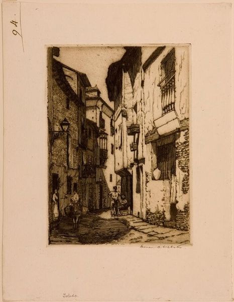 Curator: This is Camille Pissarro's "A Street in Rouen," a delicate etching rendered on paper, now residing at the Harvard Art Museums. Editor: Ooh, it has this quiet, almost hushed quality. Like stepping back in time... or perhaps into a half-remembered dream. Curator: Absolutely. Pissarro's technique really highlights the labor involved in printmaking. Notice the cross-hatching, the precise lines etched into the plate. Editor: It's funny, I almost don't notice the labor; instead, I just feel the timeless quality of the street. It feels like a world just waiting for someone to walk through it. Curator: The printmaking process itself democratizes art. It allows for multiples, for broader consumption. It challenges the idea of the unique art object. Editor: I find myself wondering about the lives of those who walked this street. Did they notice the cathedral looming in the distance, or were they just thinking about their next meal? Curator: That’s the magic of Pissarro, isn't it? To find the grand in the everyday, and the everyday in the grand. Editor: Yeah, this has definitely made me think about how art and life intersect.