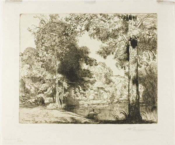 Editor: We're looking at J.M.W. Turner’s "Solitude," plate 53 from *Liber Studiorum*, possibly from 1814. It's an etching, a print, and a drawing on paper, all in one. The sepia tones give it a dreamy quality, but something about the broken tree on the right feels a bit melancholic. What do you see in this piece? Curator: Immediately, the symbolic weight of the landscape resonates. Notice how Turner situates the castle—a symbol of established power and perhaps the past—in the hazy distance, almost swallowed by the light. Meanwhile, in the foreground, we have this gnarled, fractured tree you mentioned. Editor: The one that looks like it might fall any second? Curator: Exactly! Consider that image alongside the reclining figure. Is it someone finding solace, or are they isolated? Turner masterfully presents us with these dual possibilities, asking us to consider the human condition against the backdrop of time and history. The very title *Liber Studiorum* suggests it’s meant to be a book of studies. What does that tell you about Turner's intent? Editor: Maybe that it’s meant to provoke thought, not just to be beautiful? To almost guide us? Curator: Precisely. Each element—the light, the distant structure, the broken tree, even the reclining figure—becomes a kind of hieroglyph, pregnant with meaning. It's a fascinating commentary on permanence and fragility, wouldn't you agree? Editor: Definitely. I initially just saw a pretty landscape, but now I see all these layers of meaning packed into it. Thanks for pointing those out! Curator: And thank you for bringing your insightful observations to this space. It’s by unpacking those layers that we keep these images, and the cultural memory they carry, alive.
