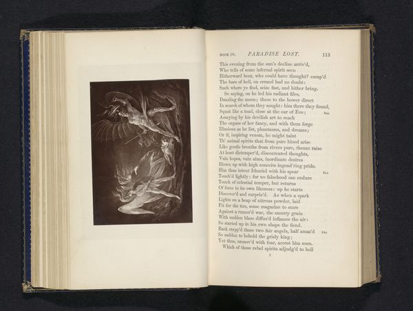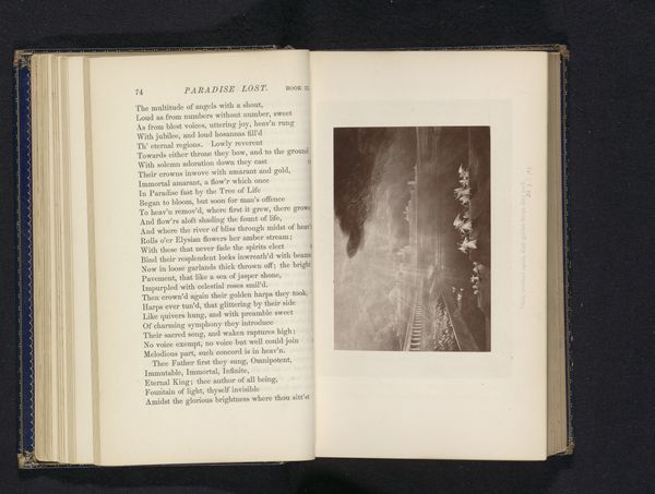 This photograph reproduces a print, by an anonymous artist. It represents Adam accusing Eve of the Fall. The image is small, about 8 by 12 centimeters, and is bound into a book. The story of the Fall, as told in Genesis, had a tremendous impact on Western culture, shaping ideas about gender roles, temptation, sin, and the relationship between humanity and the divine. In most interpretations of the Bible, Eve bears most of the blame. Here, Adam's gesture reinforces this tradition of laying the blame for original sin at Eve’s door. The image creates meaning through visual codes and cultural references. It draws on the long history of biblical illustration while reflecting the social and cultural context in which it was made. To understand this image better, a historian might study the circulation of such images in nineteenth-century Europe, asking how this photograph of a print, bound in a book, participated in the public role of art.