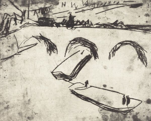 Léon Spilliaert captured this view of Ostend docks with brush and ink, and the artist's singular eye, on paper. The eye is immediately drawn to the stark contrasts between the dark, brooding forms and the light, muted background, which creates a haunting, dreamlike quality. Spilliaert destabilizes traditional landscape painting. Instead of offering a picturesque view, he presents us with a scene defined by heavy, geometric shapes and a muted palette. The near absence of color emphasizes the structure, reducing the scene to its most basic forms. His inky strokes create texture and depth, adding to the painting's melancholic mood. Spilliaert invites us to reconsider how we perceive space and form through a composition that embraces a non-illusionistic space. This work doesn't just depict a place; it embodies a feeling, a state of mind. The quivering black marks against the stark paper are not merely representational, but rather, they function as signs within a semiotic system, conveying a sense of loneliness and introspection.