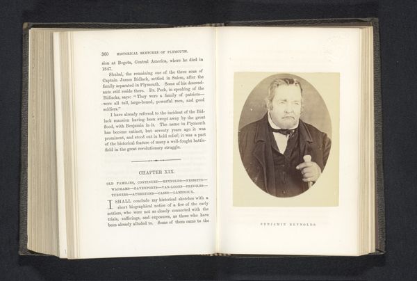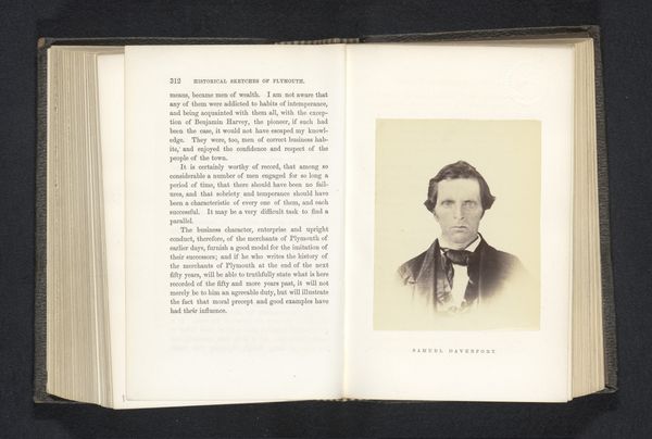 Curator: Here we have a reproduction of a portrait of Samuel Wadhams, likely made before 1873, presented as an albumen print. What's your first take on this piece? Editor: It strikes me as quite dignified, even somber. The light is soft, focusing our attention on his face, but there’s also a clear visual weight to his dark jacket, anchoring the image. It feels very deliberate. Curator: Indeed. The albumen print process itself lends to that somberness; creating depth and warmth through chemical reaction, rather than mass mechanical reproduction. Notice the tonal gradations. It’s not merely a surface-level depiction, but rather, reveals detail as we gaze at it longer. This particular printmaking method was commercially popular, meaning portraiture became far more accessible, contributing to a growing middle-class consciousness around visual representation and memorialization. Editor: Interesting. I'm immediately drawn to the symbols of status here. His carefully arranged cravat, the cut of his coat, are all indicators of societal position and, by extension, values. It also feels inherently…American. A certain pragmatism and emphasis on self-presentation, reflecting an era concerned with shaping a national identity, are very subtly, very subtly conveyed in how he chose to have himself represented. Curator: You’re spot on about the construction of identity through material symbols! These visual elements, when combined with accessible, yet permanent albumen printing technologies, played a major role in cementing ideas around ideal manhood during the 19th century. Editor: The gaze, too. He looks directly at us. There is something direct and self-assured in this gaze, an implied moral uprightness even. The image says as much about the values he wished to project as it does about the individual man himself. Curator: And now we view the artifacts as symbols, representing cultural history. It gives pause to think how deeply interwoven the production process, even in these reproducible mediums, is with individual and communal intention, isn’t it? Editor: Absolutely. Analyzing images such as these shows how much a seemingly simple photograph can tell us. These historical impressions remind us to consider that beyond the process, material, and even the sitter, images endure as symbols of lived moments, carrying forward echoes of memory and intention.