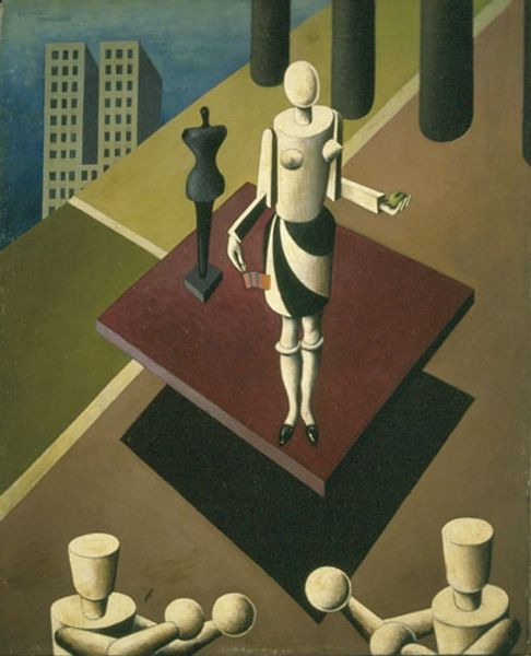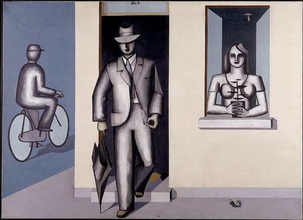 Victor Brauner's painting "Conspiration" presents us with a world of strange figures rendered with precision. The smooth, almost airbrushed finish gives it a feeling of hyper-reality, which for me, heightens the sense of unease. I love the way Brauner uses color to create distinct zones within the painting. The deep blues and blacks create a stark contrast with the flesh tones and architectural elements. This division emphasizes the artificiality of the scene, almost like a stage set. Notice that flat wooden beam that pierces the figures. It feels like a crude device, disrupting the supposed harmony of the composition. Brauner’s work reminds me a little of Giorgio de Chirico, another master of unsettling juxtapositions. But while de Chirico creates a sense of melancholy, Brauner’s painting has a more sinister edge. What is this conspiracy? We may never know, but it's a reminder that art, at its best, can pose questions that linger long after we’ve turned away.