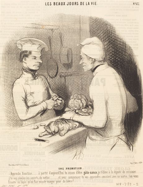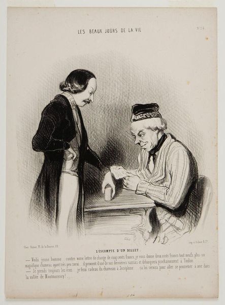 Curator: Here we have Honoré Daumier's lithograph, "L'Escompte d'un billet," created in 1844. It offers a glimpse into 19th-century Parisian life. Editor: The contrast immediately strikes me. The heavy shadows cast on the standing figure compared to the brighter, almost comical rendering of the seated man creates a sense of unease and imbalance. Curator: Indeed. Daumier often used his art as social commentary. The lithograph, with its wide circulation, became a powerful tool for critiquing the bourgeoisie and the political landscape. Here, he seems to be highlighting financial transactions, likely exploring themes of exploitation and class disparity in 1840s France. Editor: The composition is rather stark, wouldn't you say? Notice how Daumier directs our gaze with the line of the table leading straight to the money-lender’s face. The stark simplicity amplifies the tension. It's not just what's depicted, but how. Curator: And it's worth noting how Daumier navigates censorship. While explicitly political, the scene's vagueness allows it to circulate while still conveying its message of societal corruption. The title, "The Discounting of a Bill," itself speaks to the exploitative lending practices of the time. It reveals Daumier’s alignment with Republican ideals, in his critical analysis of social exploitation. Editor: Technically, the hatching and cross-hatching contribute so much. Look at how they model the forms, creating a tangible texture that is almost tactile. He’s so economical with his lines! Curator: Daumier understood his audience. He created works accessible to the growing middle class, who may not have visited the Louvre, but certainly encountered his lithographs in newspapers and print shops. He exposed financial inequalities to people often experiencing its burdens themselves. Editor: For me, Daumier's formal choices—the contrast, the harsh lines—aren't merely representational; they are intrinsic to understanding the emotional weight and meaning of the scene. The work’s effect rests upon these calculated choices as much as the commentary. Curator: He masterfully integrated artistic skill with social critique. A talent for us all to take inspiration from today. Editor: Indeed. It leaves one pondering on how artists can cleverly expose economic inequality with such powerful effect even now.