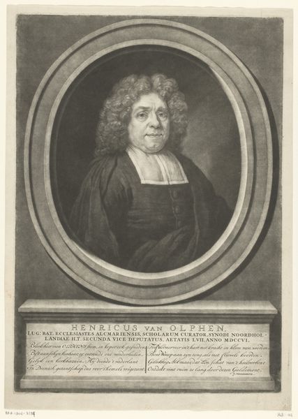Curator: Good morning! We are looking at a print from 1694 by Johan Friedlein titled "Præsten Bernhard Kenckel," here at the Statens Museum for Kunst. The artwork captures a distinguished-looking man within a framed oval. What's your first impression? Editor: He has kind eyes, a generous mouth... but something about that stark, pleated ruff and tightly curled wig gives off serious social power. This image clearly announces something beyond just individual identity, which I imagine to be about class and belonging, right? Curator: Precisely. Bernhard Kenckel, the subject, was a pastor. That elaborate collar and wig, in monochrome print, signal not just status but a very particular kind of controlled authority, a visible declaration within 17th-century Danish society. Editor: It's a constructed image. The baroque period really mastered visual performance. And the Latin inscription… Is that standard for portraits of clergymen from the time? What is the inscription conveying here? Curator: The inscription flatters both the engraver and the sitter. It’s an intricate rhetorical flourish suggesting Kenckel’s outer appearance was skillfully rendered like Apelles – ancient Greek artist – would do but that his genius is beyond portrayal. He will forever reside in heaven (arce Poli). Editor: Oh, wow. That definitely raises the stakes. It isn't just about his earthly importance but almost sanctifying him posthumously. The family surely was happy about such glorification! Also, that carefully lettered frame—encircling his head like a halo, right?—reinforces that impression of authority and piety. This is all about maintaining social hierarchies. Curator: Yes. Every element works to cement his position within a specific social and religious framework, offering him near immortality. Editor: Fascinating. It’s amazing how much information about power and faith Friedlein and Kenckel embed in what appears to be a simple portrait. I'll definitely keep an eye on this particular approach from now on! Curator: Agreed! There’s always much to discover, beneath the surface in art, no?