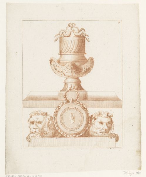 This drawing of a vase with flowers was made by an anonymous artist, using pen and brown ink. The fine lines of the drawing, rendered in sepia tones, give the vase a delicate, almost ephemeral quality. But consider the real-world object that's being represented here: a substantial urn, probably made of stone or ceramic, adorned with garlands and set upon a plinth. Vases like this would have been prominent displays of wealth in gardens of the period. The flowers they contained, often imported at great expense, were another signifier of status. The drawing itself, with its precise draftsmanship, reflects the skilled labor involved in both the design and potential fabrication of such an object. It reminds us that even seemingly effortless displays of beauty often have a complex relationship to labor, politics, and consumption. It challenges the divide between fine art and decorative arts.