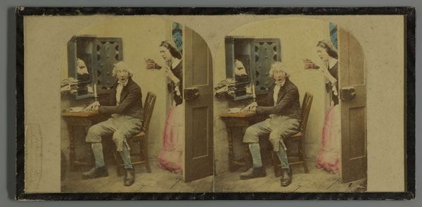 Editor: This is a fascinating gelatin-silver print from sometime between 1854 and 1859, titled *Twee mannen schrikken van een spook*, or *Two Men Startled by a Ghost*. It has an uncanny stillness, and it almost feels like a staged tableau vivant. What kind of narrative do you see at play here? Curator: Notice how the supposed "ghost" resembles draped cloth – think of it as a *spiritus loci,* the genius of a place revealing itself. These men, in their tradesmen's garb, represent everyday life, yet the ghost injects the surreal, a subconscious eruption of anxieties about mortality, economic instability, and even class identity during the rapidly changing mid-19th century. Editor: So, you're saying the ghost isn't literal? More like a symbol for societal fears? Curator: Precisely! The very act of photographing this “ghost” becomes symbolic. The photographic medium was itself viewed with suspicion, capable of capturing what the human eye could not normally perceive. Do you see how the clock in the background hangs crooked? It seems almost intentional, adding to the disorientation. Editor: Yes! It adds to the unsettling feeling. What do you think the artist hoped to capture by employing photography instead of a painting, which was of course much more established? Curator: Photography offered the allure of truth, a "scientific" record. To stage a ghost encounter, using this then-modern tool, imbued the image with a supposed objectivity while simultaneously revealing the anxieties of a society wrestling with technological advancement and spiritual uncertainty. A painting wouldn’t have carried the same weight. Editor: I see that it creates such an amazing tension! Curator: And tension is often where the most evocative and interesting symbols reside. So next time you come across symbols, you can also approach it like a Rorschach test – what personal connections do *you* bring to these symbols? Editor: Wow, I'll definitely think about it that way! Thanks, that gives me so much to consider with my own art, and with understanding others'.