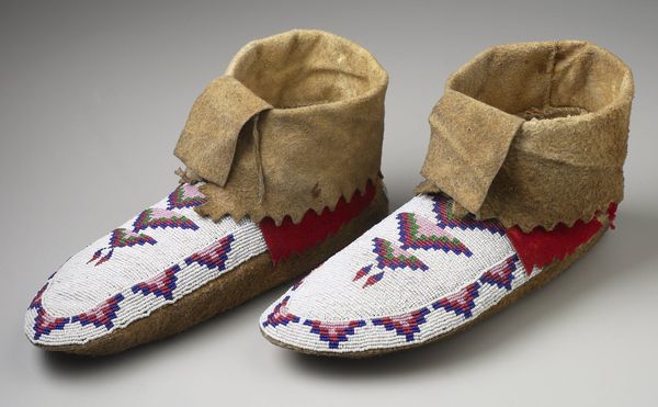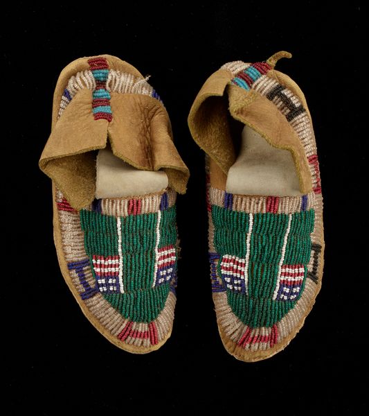 Editor: Here we have a "Pair of Moccasins," created around 1890 by an artist from the Nakoda (Assiniboine) community. The moccasins are textiles adorned with beadwork. I'm struck by the intricate geometric designs and the vibrant, almost playful, color palette. What stories can these moccasins tell us? Curator: These aren't just shoes; they’re potent symbols of identity and resistance. The beadwork, with its careful geometry, represents far more than decoration. How do you see the act of creation relating to cultural survival? Editor: I suppose the act of creating something so beautiful and personal, within a context of cultural disruption, is a way of maintaining and celebrating that culture. Curator: Precisely. Consider the context: these were created during a period of intense pressure on Indigenous communities. The U.S. government's policies aimed at assimilation. So, what does it mean to meticulously craft something deeply connected to your heritage in that environment? Editor: It seems like an act of defiance. Like reclaiming cultural space in a world that’s trying to erase it. Curator: Exactly. Each bead, each stitch, is a statement. They are saying, "We are still here. We are still Nakoda." These moccasins connect back to the land, spirituality, community and identity. Editor: I never thought about beadwork in those terms before. It is easy to focus solely on aesthetics rather than on history. Curator: Right! Objects like this allow us to think about the lives and experiences of indigenous people from their point of view and the historical impact. Editor: It shifts my understanding entirely. Curator: Mine too. Thank you.