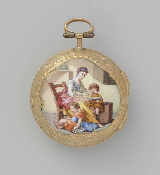 Curator: How precious! The artist has managed to capture a moment of serene intimacy. The faces are painted with such detail, particularly the eyes. Editor: And that's precisely what’s so interesting about this piece. Pierre Henri painted "The Artist's Family" around 1800. It's a tempera on ivory miniature, offering a fascinating look into familial representation at the dawn of the 19th century, deeply influenced by emerging Neoclassical ideals. Curator: You can certainly feel the neoclassical influence in the composition and the sitters’ garments. Beyond the art historical context, I'm drawn to the way it depicts family. What do you make of the woman’s gaze and position, with three of the children gathered around her, almost like the Virgin? Editor: I am immediately taken by the small portrait worn as a pendant, most likely representing the father of this family. Its presence signifies his importance even in absence and invites questions of family structure, legacy, and gender roles in that period. There is also a visual motif; the color story subtly evokes a sense of tenderness. Curator: Right, the tones feel carefully calibrated, particularly with the blues and pinks against the mother’s white headdress. Thinking about the pendant, it seems to reinforce the societal structures, and the constraints they placed on women of that era. While visually sentimental, perhaps, this piece also points to broader societal restrictions? Editor: Absolutely. But considering its Neoclassical roots, we should consider how classical mythology was being appropriated in these portraits. Take for instance, the almost porcelain rendering of the figures or their gentle grouping: It signals more than a family connection, almost hinting at a conscious connection to ideas of beauty, order, and the symbolic weight of kinship. Curator: The intimacy it conveys, and how this intimacy gets framed by ideas of social constraint, familial expectations, makes the painting even more evocative. It is a tender snapshot imbued with a complex undercurrent of societal structure and meaning. Editor: Precisely. The painting exists at the intersection of artistic expression and social documentation. And the size and composition almost allows it to act as an emblem of the family, carrying both history and significance with each carefully selected color and gaze.