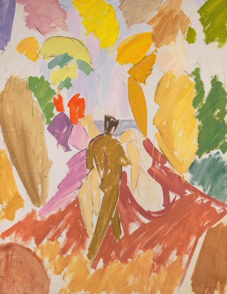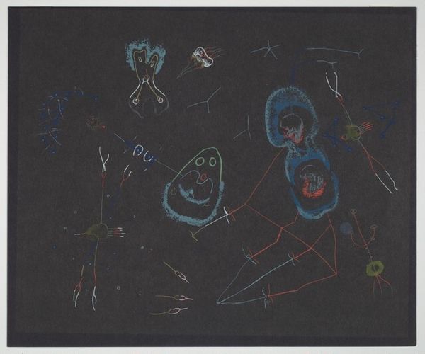 Curator: Right now, we're looking at an untitled drawing by Edvard Munch. It’s a work on paper, likely pastel and coloured pencil. Editor: The first thing that strikes me is its dreamlike quality. Like peering into a memory, hazy edges, soft hues, that little pink figure seems to float. Curator: Yes, that ambiguity is key to Munch. Though recognized as a landscape piece, it's definitely not trying to give you realism. The way the crowd in the foreground blurs and almost becomes abstract adds a kind of anxiety. Editor: I think that anxiety is intrinsic to depictions of public entertainment. Think about how vulnerable performance always is. And the fact that we only see the backs of the heads of the crowd is pretty intense, there's an erasure and perhaps objectification that is inescapable. The red figure almost reads as trapped, despite the implications of its profession. Curator: Hmm. Trapped, maybe not entirely. Look how he often represents human figures within stark natural settings – almost dwarfed by nature's power. I feel some of that resonates in this drawing. Perhaps that red figure dancing on the stage suggests the fragile triumph of the human spirit facing an unfeeling world? Editor: The “triumph of the human spirit” is often tied to capital in ways we shouldn't ignore. Even though we don't know what is being presented on stage in the image, we have to acknowledge the historical context in which Munch created his art, rife with socio-economic exploitation of certain populations more than others. And furthermore, look how this imbalance is recreated in the image itself—a mass of bodies stares upward as someone risks bodily harm for their entertainment. The artist may not have been trying to illustrate this exact point, but it doesn't mean it is not there. Curator: Well, that’s a particularly critical lens through which to view Munch. He was obviously tapping into something emotionally primal—an existential rawness—and you're grounding that reading in material, capitalist forces... Editor: Yes. My experience of any artwork is going to exist between the art and what it says about personhood, our politics, what matters. And hopefully complicate the way we see. Curator: Okay. Always appreciated. I leave this piece now with an added question: Is there always inherent inequality built into moments of joy?