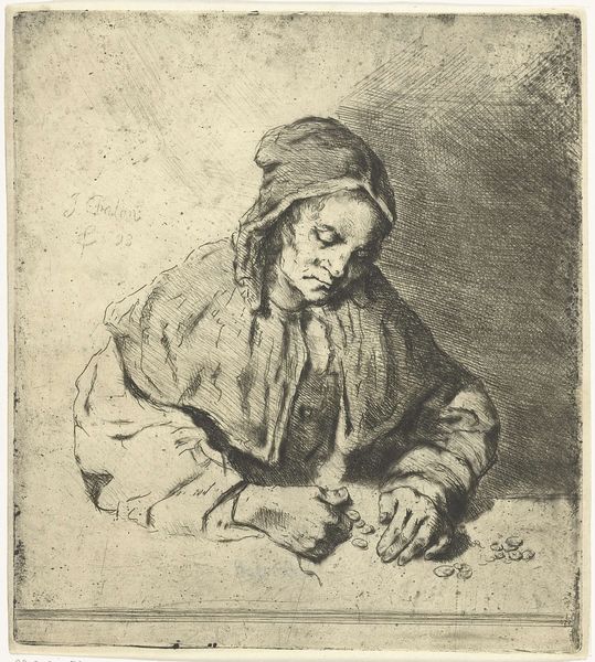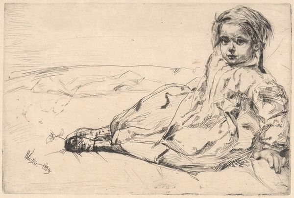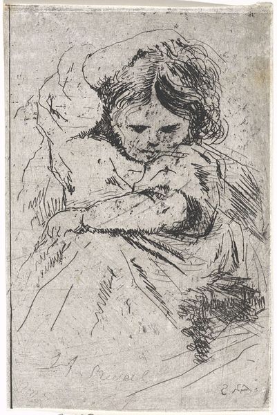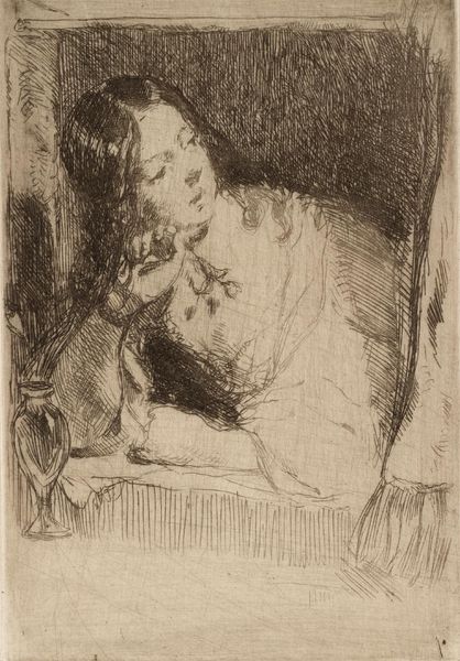 Editor: This is Marcellin Desboutin's portrait of Nina de Villard, etched with incredible detail. It's striking how she's posed, almost as if caught in a moment of contemplation. What can you tell me about its place in the art world of the time? Curator: Desboutin's etching captures a Parisian salonnière, and it's a commentary on the role of women in artistic circles. Consider how women were often muses, but rarely recognized as artists themselves. How does this portrayal challenge or reinforce that dynamic? Editor: That's fascinating! It makes me wonder about Nina de Villard's agency and if Desboutin's etching could be perceived as subversive. Curator: Precisely. The image circulates, becoming a public representation. Desboutin, through this print, engages in the politics of imagery, framing Villard within specific social and cultural contexts. Editor: I hadn't thought about it that way. Now I see how much more there is to this image. Curator: Indeed, art reflects and shapes our understanding of history.
