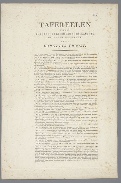 Willem Kok produced this etching, "Bericht van de uitgever over het opstarten van de prentreeks Atlas der Geschiedenissen van onzen tyd," in 1787. This announcement, translated as "Publisher's report on the launch of the series Atlas of Histories of Our Time," provides us with insight into the cultural and intellectual milieu of the late 18th century. The Atlas reflects the Enlightenment's emphasis on reason and the encyclopedic desire to document and classify the world. As the Dutch Republic was undergoing political and social upheaval, the "Atlas" sought to make sense of a rapidly changing world through the visual representation of current events. Notice the density of the text, framed by a decorative border; this announcement highlights the importance of disseminating knowledge to a wider audience. The Atlas served as a means of shaping public opinion and constructing a collective understanding of the era. It captures a moment in time when the power of the press was beginning to be recognized as a force. The "Atlas" and related announcements reflect a society grappling with questions of identity, knowledge, and the representation of history.