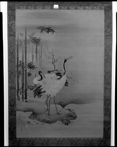 Editor: This is Utagawa Hiroshige's "Mandarin Ducks", a woodblock print. It seems so delicate. What's striking is the contrast between the detailed depiction of the ducks and the more abstract background. What can you tell me about it? Curator: It's fascinating to consider the socio-economic context of woodblock printing. These prints were relatively affordable, a form of mass production, and thus accessible to a wider audience. How does this democratization of art influence its interpretation? Editor: So, thinking about art as a commodity changes how we see it? Curator: Precisely! The availability of materials, the labor involved, and the intended audience all shape the artwork's meaning. It pushes us to consider art's social function beyond just aesthetics. Editor: That makes me think about the role of craft and labor in art history. Curator: Exactly. By examining the processes of making, we can understand the material conditions that shaped artistic expression.