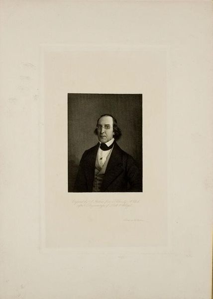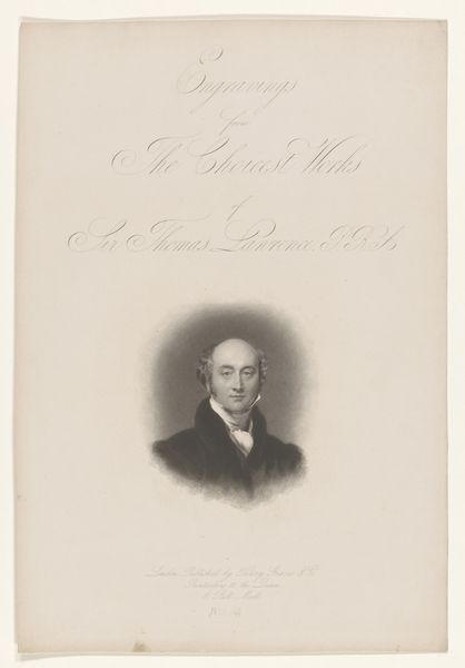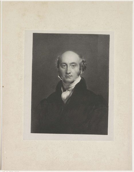 Curator: This is Samuel Cousins' "Sir Thomas Lawrence," housed here at the Harvard Art Museums. Editor: The subdued tonality is immediately striking. The stark contrast seems to amplify the sitter's gaze. Curator: Observe how Cousins employs mezzotint to render Lawrence’s likeness. The velvety blacks and subtle gradations of light define the form. Editor: Mezzotint—a labor-intensive process. It highlights the dedication to craft involved in replicating an image, a stark contrast to our digital age. Curator: Precisely. The composition guides our eye from the bright face down the dark cascade of his coat. It’s an elegant hierarchy. Editor: It certainly elevates Lawrence, imbuing him with an aura of importance. The medium itself suggests a level of prestige and value assigned to image production at that time. Curator: Indeed. A masterful exercise in tonal control and composition. Editor: An interesting insight into the materiality of portraiture, and its role in constructing status.