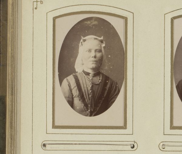 This is a photograph by W.G. Kuijer & Zonen titled 'Portret van een jonge vrouw met witte klederdrachtmuts en halsketting' which translates to 'Portrait of a young woman with white traditional dress hat and necklace'. This image offers a glimpse into the cultural and social landscape of the Netherlands during the period when photography was emerging as a powerful tool for representation. The sitter's traditional attire and necklace speak to the visual codes of regional identity, while the format of the photograph suggests a culture of collecting and display. Photographs like this one provide valuable insights into the ways people sought to represent themselves and their communities. By exploring studio records, local histories, and costume collections, we can unpack the social meanings embedded in this image and better understand the cultural values of the time. Ultimately, this photograph reminds us that art is not created in a vacuum, but is deeply intertwined with the social and institutional forces that shape it.