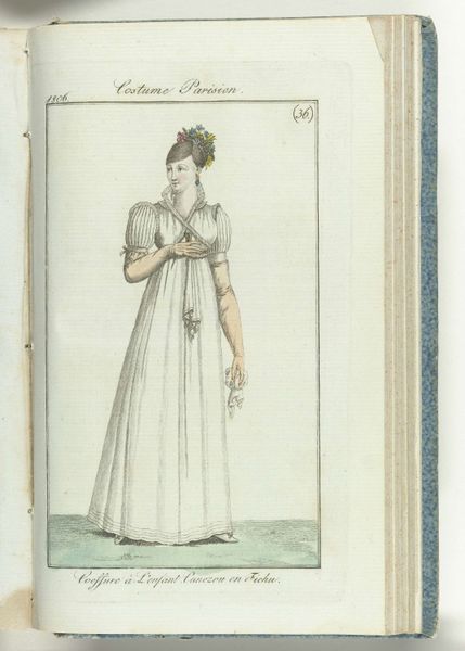 Curator: This illustration, dating from 1808, is entitled "Elegantia, of tijdschrift van mode, luxe en smaak voor dames, Oktober 1808, No. 58: Capote de Taffetas...", part of an anonymous series showcased here at the Rijksmuseum. It appears to be executed with ink and watercolour on paper. Editor: My first impression is of delicate constraint. The palette is muted, but the columnar composition lends a certain formality, even as the figure twists slightly to engage the viewer. Curator: Interesting choice of words. "Constraint" speaks, perhaps, to the sartorial restrictions of the time but, more importantly, the modes of production of textiles. Fabric such as the fine taffeta was costly, handmade and subject to intense scrutiny in its making by workshop owners who maintained hierarchies that valued expertise and exploited labour, and by those who purchased them to visibly display and perform status. The lace trims were also most likely painstakingly made, by hand, making this garment an exorbitant purchase and one which would also take considerable labor to create and maintain. Editor: The trim offers a delightful visual counterpoint, almost fracturing the imposing central column created by the dress. Note the interplay of shadow and light that brings out the crisp edges of each loop. Semiotically, the repeated curves act almost like linguistic pauses that break up any imposing feeling of class in the composition by inviting a closer examination, thus questioning an assertion of upper class elegance by playfully disarming the gaze. Curator: While I acknowledge the visual dynamic, I argue that this careful design underscores social divisions rather than disrupts them, which is achieved because those materials were costly in both purchase price and labor. For the rising bourgeoisie, fashion periodicals helped to democratise access to stylistic codes by revealing current silhouettes. Such periodicals fuelled a consumerist culture keen on imitating upper classes, yet those same social strata frequently enacted the oppression needed to uphold this elegance via gendered and raced exploitation in colonial manufacturing of fabrics. Editor: An astute point. The soft, Romantic aesthetic does mask some harsh economic realities. This work's enduring strength arises not just from how it manifests beauty and luxury through its fine strokes, colours and design elements, but it serves as an artefact through which to consider labor issues of past and present industries. Curator: Indeed, our divergent readings highlight fashion’s duplicitous role—both mirror and mask, pleasure and burden.