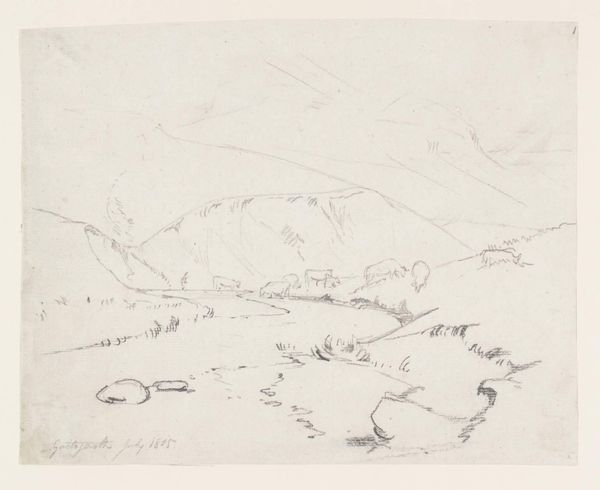Curator: Isaac Levitan created this piece, titled "Village by the ravine," in 1895. It’s a drawing, primarily ink and pen on paper. What’s your first impression? Editor: The sketch certainly evokes a sense of solitude. There’s something very stark about the composition, almost like a ghost village in winter. Curator: Observe how Levitan uses only line to define the spatial relationships. The precision, though minimal, shapes our experience of distance, focusing on near versus far. Editor: Absolutely, the economy of the line is striking. Notice how those two small houses anchor the foreground. They serve almost as symbols of domesticity amidst a more abstract landscape. Are we meant to feel sheltered or isolated? Curator: The buildings exhibit parallel lines denoting the dark sides and minimal lines creating perspective on the illuminated sides; it draws our gaze across the plane in a structural way, doesn't it? He’s really thought about how lines denote space. Editor: True, that structural interpretation is valid. However, the imagery hints at the Russian concept of "toska"—a longing, or spiritual ache, so embedded in the culture. Village iconography often embodies nostalgia for simpler times. Curator: "Toska" is an interesting reading, yes, it resonates; the high contrast makes for such strong symbolic language. It's all about how the linear structure implies form in this bleak setting. Editor: It also resonates considering Levitan's own history of melancholia, a frequent subject throughout much of Russian art of this era. This, of course, can bleed into his composition as much as the ink itself. Curator: I agree. It brings added perspective knowing a bit of his history; perhaps my reading it as solely structural and spatial has fallen short on accounting for feeling. Editor: On the contrary! Your breakdown made me notice those stark angles anew; without them, it is likely just a sentimental rendering of "days gone by." Thank you! Curator: The interplay between objective form and emotive symbolism, fascinating!