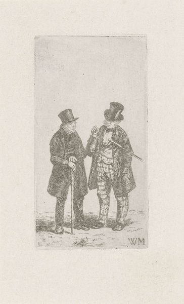 This undated print, "Twee mannen met wandelstok en hoge hoed", by Christiaan Wilhelmus Moorrees, presents us with a study in contrasts, rendered in delicate lines on a small scale. Two men, distinguished by their attire and posture, dominate the composition, their presence defined by the sharp lines of their clothing against a muted backdrop. The figures are rigidly posed, each holding a cane, yet they differ markedly in their engagement: one is in contemplative repose, while the other gestures animatedly. Moorrees seems interested in exploring the interplay of form and social commentary. The rigid lines and structured composition suggest a world of order, yet there’s an inherent tension in the figures' expressions and body language. The contrast between the figures introduces a semiotic system of signs—the canes, hats, and clothing styles—each hinting at status, intention, and the silent dialogues that define social relations. Through this meticulous etching, Moorrees provides not just a visual record, but an ongoing discourse on identity and societal roles.