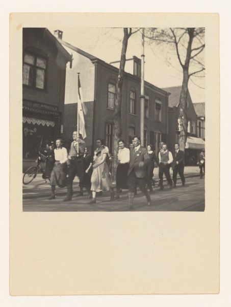 This anonymous photograph, simply titled "Optocht NSB," captures a parade of the National Socialist Movement in the Netherlands. The grayscale palette gives a documentary feel, as if the artist is simply recording an event, yet the tonal range creates a world of depth. The surface texture is smooth, as we expect from a photograph. There is a richness in the midtones, particularly visible in the blurred background, which creates an emotional nuance that invites us to think about history as both fact and feeling. This isn’t just a snapshot, but a contemplation on the past. Look at the way the photographer has framed the figures. The slight blur in the background almost mimics the way Gerhard Richter might have handled a similar subject. What does it mean to obscure something, or to allow the materiality of an image to shape what we see? This piece reminds us that art, even in its most representational form, is always a constructed reality, and that our emotional reaction can never be fully separated from the message being conveyed.