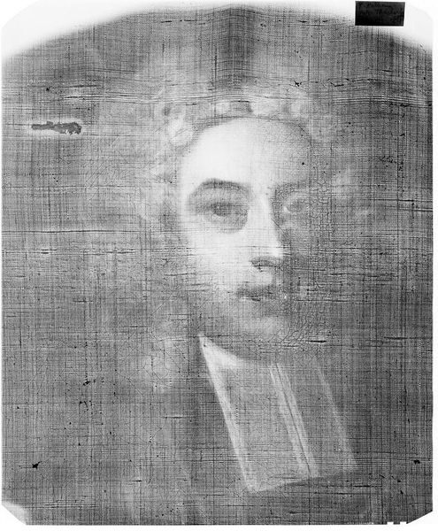 Editor: Here we have an X-radiograph of "Margaret Sewall," attributed to John Smibert. It's fascinating to see this beneath the surface. What can you tell me about this piece? Curator: It reveals the labor and material processes hidden in the painting’s creation. Consider the artist's hand and the physical act of layering paint; this image hints at the evolution of the portrait, maybe revisions, the underpainting, and the canvas itself. Editor: That's a very different way of looking at it than I would have expected. I'll keep that in mind. Curator: Indeed, it moves beyond just the surface-level depiction to the very means of production.