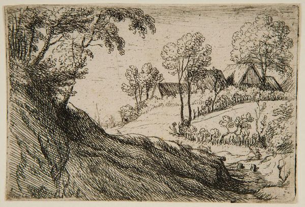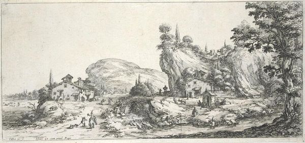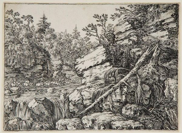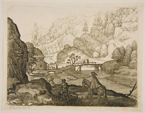 Editor: Here we have Allart van Everdingen’s etching, "Three Travellers Followed by a Porter." It presents a detailed landscape with figures, but its overall mood feels almost documentary. What do you see in this piece in terms of its broader context? Curator: Well, consider the period. Landscape art was emerging as a distinct genre, reflecting a growing interest in the natural world and, importantly, national identity. This etching participates in a visual discourse shaping Dutch perceptions of foreign lands, specifically mountainous regions, perhaps Scandinavia. Editor: So, the image is not just a landscape, but is framing a particular view? Curator: Precisely. The inclusion of the travellers and the imposing landscape subtly suggests Dutch exploration and perhaps even dominion over nature, a visual articulation of cultural power. What do you make of the detailed rendering of nature? Editor: I hadn't thought about it that way. Seeing it as a statement about cultural perspectives and power really changes how I look at this piece.