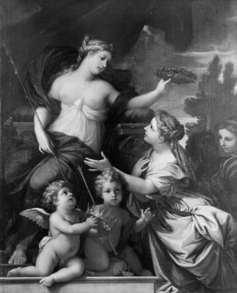 Curator: This painting, titled "Allegory on Music," was completed in 1696 by Pieter van der Werff. It’s currently housed here at the SMK, the Statens Museum for Kunst. Editor: Immediately, the somberness in its monochromatic tones stands out. And that weeping statue in the background only seems to deepen the pervading sense of quiet melancholy. Curator: Precisely. Allegories often rely on recognizable symbols, and that figure suggests mourning or penitence, setting a moral tone, perhaps about the fleeting nature of earthly pleasures even as it depicts those pleasures. Editor: Yes, and the woman with the lute—the sharp angle of her arm, the slope of her neck-- is interesting. And then that putto clutching her robe is drawing my eye downwards along a diagonal that pulls the composition together. Curator: Van der Werff's baroque training would have exposed him to mythological and allegorical subjects, so portraying music as a kind of alluring, partially unclothed muse makes a great deal of sense when viewed within its artistic context. Editor: The scattered papers and the discarded measuring tool – a set square, perhaps? – seem placed intentionally as if to invite us to engage in an intellectual decoding exercise. I notice also that the lute player has an opened musical score near her, suggesting learning and creation, but it has the distinct aura of still-life, somehow. Curator: Music, as portrayed here, becomes an intellectual exercise, not merely frivolous entertainment but also part of the whole world of mathematics and architecture... All of which come to mind with that set square as the materialization of these notions. And beyond the primary allegory, do you think there's an erotic element at play, too? Editor: Absolutely. While ostensibly a moral allegory, the overt sensuality—the woman's pose and partial nudity—hint at the complicated intersection of virtue and worldly delight which so typified the baroque imagination. There's an appealing visual tension created with the juxtaposition of grief and celebration. Curator: In short, this oil-on-canvas work serves not merely as visual enjoyment, but also demands active interpretation on our part, an investigation into layers of meaning, all while delighting our senses. Editor: Absolutely. By exploring the visual structure and allegorical elements, we gain insights not only into Van der Werff's technique but also the era’s philosophical questions. It feels as if there is always more to decipher.
