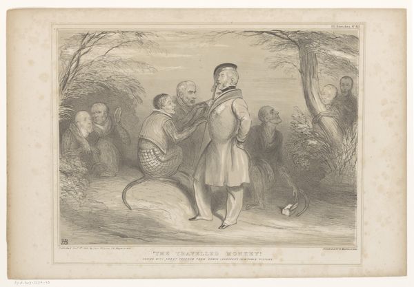 Editor: Here we have “Spotprent met Lord Russell als Tancredi,” or "Cartoon with Lord Russell as Tancred" by John Doyle, possibly from 1847. It appears to be a drawing and print in pencil. It has such a foreboding atmosphere; the figure looks rather anxious surrounded by those eerie trees. What stands out to you, looking at this piece? Curator: The composition certainly arrests the eye. Observe how Doyle employs chiaroscuro, the dramatic contrast between light and dark, to amplify the sense of unease you astutely noted. Note the strategic placement of the figure, slightly off-center, which creates a visual imbalance, reinforcing his precarious position within the "enchanted forest". The "Irish Party" marked tree further alludes to tension through symbolic figuration, does it not? Editor: I do see that tension, especially how the lines become more frenetic around the trees with faces compared to the smoother lines on the knight. Is the 'imbalance' of dark vs. light a crucial element in political cartoons generally, given the charged messages? Curator: Precisely! In cartoons, imbalance can serve as a powerful visual rhetoric. It directs the viewer's gaze and underscores the cartoon's polemical point. Consider the sharp contrast between the smooth planes of the knight's armor and the gnarled textures of the forest; such visual disruptions unsettle our gaze, enhancing the narrative's inherent conflict. The very texture of the lines serves meaning here. Editor: That’s fascinating. So the visual qualities themselves, even without knowing the specific political context, create that feeling of tension. I’ll definitely pay closer attention to the use of light and line quality in other political cartoons I study. Curator: Indeed. It's through careful examination of the formal elements that we unlock the artwork's capacity to convey complex narratives and elicit profound emotional responses. A valuable lesson.