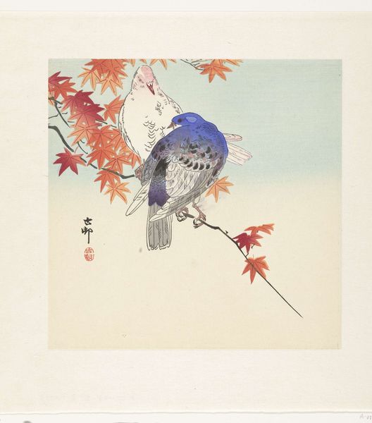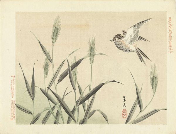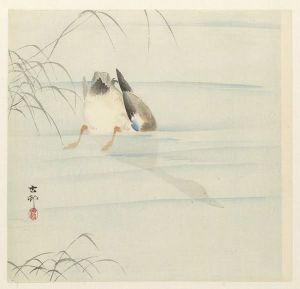 Curator: This is "Blue Nightingale" by Ohara Koson, a woodblock print made sometime between 1900 and 1930. It's currently held in the Rijksmuseum collection. Editor: My initial impression is one of gentle melancholy. The pale washes of color and the simple composition evoke a sense of quiet solitude. Curator: Absolutely. The artist’s deft use of line and form certainly draws our eye to the essence of the scene, specifically how the horizontal bamboo contrasts with the diagonal reed-like grasses in a seemingly structured dichotomy. Note the careful asymmetry—a key element of the Japonisme style. The blue of the nightingale is mirrored in the painted pipes. Editor: That blue of the nightingale certainly pops—it acts as a symbolic anchor. The bird, in many Eastern traditions, signifies joy and good fortune, although that is challenged here given its sombre and subdued colouring. Its placement atop the structure makes me think of aspiration, a fragile hope. Do you find this piece similarly emotive, given its avian focus? Curator: While I concede that emotive elements are, of course, a valid entry point for discussing Koson's design, I find it far more compelling to break down how the visual construction contributes to the print's inherent dynamism. I invite one to assess the print solely based on its design and structural elements rather than what one may deem its representative sentiment. Editor: But aren’t the cultural associations inextricably linked? Ukiyo-e prints often depicted the transient beauty of the natural world, inviting reflection on mortality. Isn't this nightingale—perhaps caught between songs— a part of that enduring narrative? Curator: Your point about Ukiyo-e's connection to transience has weight, but consider the pure materiality of the print: the grain of the wood, the registration of colors, the almost minimalist construction—the visual economy with which Koson creates a full and cohesive experience from mere water, flora, structure, and bird. Editor: Ultimately, this work presents us with enduring duality; Koson’s masterful blending of artistic composition with symbolic meanings continues to challenge one's understanding of Japanese printmaking. Curator: Indeed. "Blue Nightingale" functions successfully on both formal and symbolic levels, offering, therefore, a complex but enriching visual encounter, dependent on viewer engagement and interpretation.
