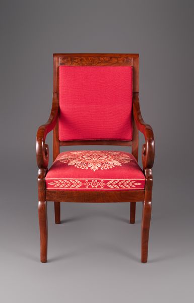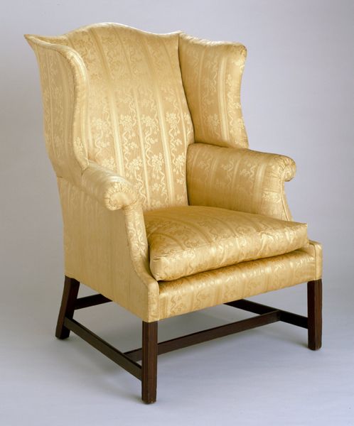 This lolling chair was made by an anonymous creator and is now housed in the Minneapolis Institute of Art. Notice how the chair's form creates a visual language of relaxation and repose. The high back and generous seat, rendered in a soft, pale yellow fabric, invite the sitter to recline and surrender to comfort. The dark, polished wood of the armrests and legs provides a grounding contrast, anchoring the chair in a sense of structural integrity. Yet, the gentle curves of the armrests suggest a yielding to the body's natural contours, echoing the chair's invitation to relaxation. The subtle floral patterns in the upholstery add a layer of visual texture, creating a play of light and shadow that softens the chair's overall presence. This careful attention to detail elevates the chair from a mere functional object to a site of aesthetic contemplation. The chair invites us to consider the semiotics of comfort, and what it means to design a space for the body to occupy with ease and grace. It represents a kind of cultural expression, where form follows the desire to relax.
