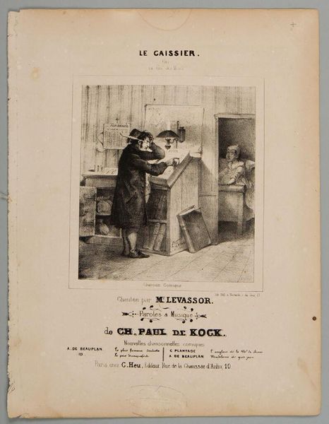 Curator: This is an intriguing piece of sheet music entitled "Nestor the Hairdresser," created by an anonymous artist. The image itself is about 14 by 14 centimeters. Editor: It's quite unsettling, actually. The hairdresser has this almost manic energy, and the client looks terrified. What's the story here? Curator: The text indicates it's a "comical scene," but perhaps it’s meant to be darkly humorous. Note the strategic use of the scissors as an almost threatening image. Editor: I see it! The salon setting, though seemingly ordinary, becomes a site of anxiety. This speaks to the commodification of beauty and the pressures put on individuals to conform. Curator: Precisely. And the figure of Nestor himself, forever captured mid-cut, becomes a lasting symbol of those societal anxieties. Editor: It’s definitely left me with a lot to consider about beauty standards and the power dynamics within seemingly mundane interactions.