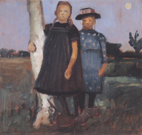 Curator: "The Pear Orchard," an 1895 oil painting by Joseph DeCamp, captures two women amidst a hazy, sun-drenched orchard. There's a lovely, relaxed quality to the scene. Editor: My first thought is a sense of almost otherworldly calmness. The women appear to be caught in a pocket of time. And the texture of that blue dress—almost shimmering! Curator: DeCamp was known for his deft handling of paint and light, characteristics we certainly see on display here. He studied in Munich, steeped in the tradition of academic painting. His artistic path showcases a shift in focus from academic principles to plein-air and tonalist influences, capturing fleeting atmospheric conditions outdoors. Editor: Notice how the painter uses a limited palette? Predominantly earth tones, greens, blues. I'm interested in the recurring motif of circles and ovals—the pears themselves, echoed in the hats and skirts. It suggests abundance but also a contained, almost womb-like, safety. What do you make of that ladder? Curator: Well, ladders often point to the means by which work can get done: in this instance the gathering of food to eat or sell at the market. Here it seems relatively fragile and unrefined, built for purpose not aesthetic beauty, made of wood presumably sourced locally to serve an agricultural pursuit. Editor: I find the symbolism intriguing, particularly the ladder leading towards the fruit of knowledge, perhaps a nod towards traditional iconography, linking the everyday with broader cultural understandings of labor. DeCamp captures the nuances of gender through costume and comportment. Curator: Certainly. The context of women and labor at the end of the 19th century is crucial, too. This image participates in broader narratives of the genteel pastoral, where class, labor, and access to nature, as well as constructed visions of leisure, reveal interesting aspects of cultural values at that moment in time. The painter invites a consideration of the means by which paintings, pear orchards, and social conventions, like women picking fruit, reflect back contemporary ideologies. Editor: Exactly. What appeared as mere “beauty” initially is now rich with allusions and implications of a moment, made even more complex by what we see in it today. Curator: Indeed. Every material decision reflects a world beyond itself, wouldn’t you say?
