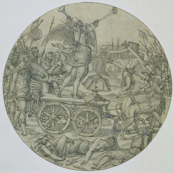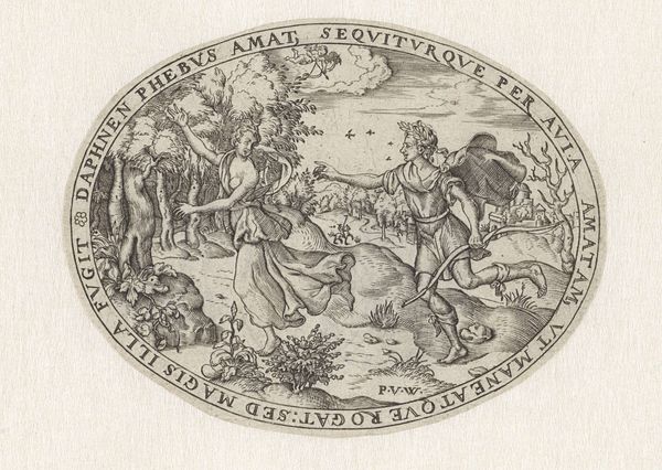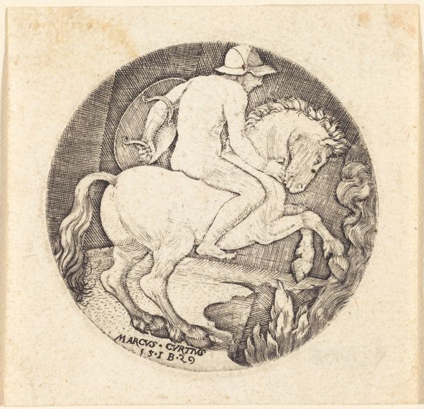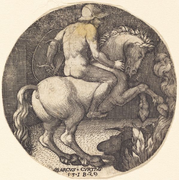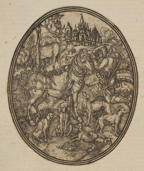Editor: So, this is Martin Schongauer’s “Saint George and the Dragon,” made around 1470 to 1475. It’s an engraving. The detail is incredible, but there’s also something almost unsettling about the dragon's goofy expression. What social commentary do you see reflected in this work, especially considering the period it was created? Curator: Well, consider the function of images like these in the late 15th century. This print would have circulated widely, carrying not just a religious narrative, but also reinforcing societal power structures. Saint George, the idealized knight, subdues the 'grotesque' dragon, embodying a Christian, masculine ideal triumphing over chaos and the 'other'. Think about who 'the other' might have been for Schongauer's audience. Editor: You mean, it’s about more than just good versus evil? Curator: Exactly! The dragon can be interpreted as symbolizing anything from heresy to paganism to, perhaps, even societal anxieties about the roles of women. Notice how the princess is a passive observer, a symbol of what needs to be rescued and controlled. How does that interplay with contemporary discussions around female agency? Editor: I hadn’t thought about that connection. So, the print is basically a political statement disguised as a religious scene? Curator: In a way, yes. Art is rarely neutral. Schongauer was visually encoding specific social values. What about the setting—does the architecture in the distance provide more context? Editor: Now that you mention it, the contrast between the chaos in the foreground and the organized civilization in the background suggests order prevailing over disorder. I guess that adds another layer to the whole political message. Curator: Precisely. By understanding the context in which these images were made and consumed, we reveal deeper meaning. Editor: I see the piece completely differently now. Thanks for connecting it to something bigger than just the story.